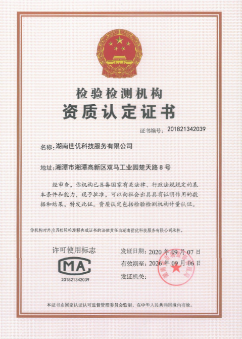 2020年9月,世優(yōu)科服已順利取得了由湖南省市場(chǎng)監(jiān)督管理局頒發(fā)的檢驗(yàn)檢測(cè)機(jī)構(gòu)資質(zhì)認(rèn)定證書(證書編號(hào)201821342039),標(biāo)志著公司在技術(shù)能力和質(zhì)量管理方面都達(dá)到RB/T214-2017《檢驗(yàn)檢測(cè)機(jī)構(gòu)資質(zhì)認(rèn)定能力評(píng)價(jià)檢驗(yàn)檢測(cè)機(jī)構(gòu)通用要求》的要求。