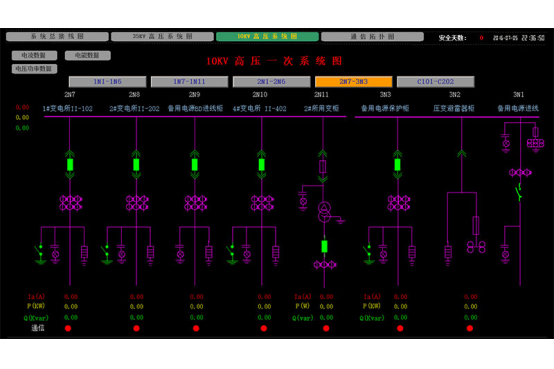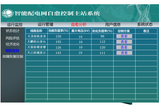 智能配電網(wǎng)自愈控制主站軟件通過智能終端設備或現(xiàn)有配電自動化系統(tǒng)對配電設備和分布式電源運行狀態(tài)的實時采集、與現(xiàn)有調(diào)度自動化系統(tǒng)的信息交互實現(xiàn)整個智能配電網(wǎng)的可感知,對配電網(wǎng)異常運行情況如線路負荷越限、母線電壓越限、變電站出口開關跳閘或保護動作給以判斷和報警,即實現(xiàn)智能配電網(wǎng)“自我感知”,可使配電網(wǎng)實時運行狀態(tài)以多種圖形、列表畫面、聲音報警呈現(xiàn)給調(diào)度運行人員;其次,在配電網(wǎng)發(fā)生故障時,系統(tǒng)應能夠利用“自我感知”獲得的全方位信息實現(xiàn)故障的判斷和定位,通過在線風險評估、預警分析、狀態(tài)劃分與評估等高級應用功能對智能配電網(wǎng)運行風險和薄弱環(huán)節(jié)進行自動識別,實現(xiàn)配電網(wǎng)的“自我診斷”;根據(jù)配電網(wǎng)“自我診斷”的結(jié)果、按照配電網(wǎng)分區(qū)運行狀態(tài)進行參數(shù)越限時的警戒控制、故障處理方案分析、配電網(wǎng)運行經(jīng)濟性分析給出不同的自愈控制策略,實現(xiàn)配電網(wǎng)“自我決策”;然后,利用遙控功能執(zhí)行相應的自愈控制策略,故障情況下配合終端快速完成隔離操作、執(zhí)行故障恢復控制為非故障區(qū)段快速恢復供電,針對重構(gòu)分析結(jié)果進行負荷轉(zhuǎn)供操作,使配電網(wǎng)運行盡可能向減少停電、消除風險、運行經(jīng)濟的狀態(tài)轉(zhuǎn)換,即實現(xiàn)智能配電網(wǎng)“自我恢復”。